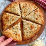A round garlic cheese pizza cut into six triangular slices is placed on a wooden board. The pizza has a golden brown crispy crust with melted cheese spread evenly on top, showing small brown spots with a slightly bubbly texture. The cheese layer is sprinkled with green herbs that add texture and color. A woman's hand is holding one slice lifted slightly from the board. In the background, there is a red and white checkered cloth and a small pile of shredded white cheese on a white marbled surface. photo taken with an iphone --ar 4:5 --v 7