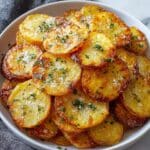 - Serve and garnish: Transfer the crispy potato slices to a serving plate. Sprinkle with freshly grated Parmesan cheese and chopped fresh herbs, such as parsley or chives, if desired. Serve hot with your favorite dip like sour cream or Greek yogurt.