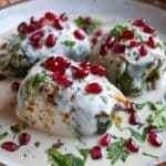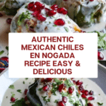 This Authentic Mexican Chiles En Nogada recipe features roasted poblano peppers stuffed with a flavorful mixture of ground beef and pork, infused with warm spices and mixed fruits. The dish is finished with a creamy walnut-based salsa de nogada, garnished with fresh parsley and vibrant pomegranate seeds, making it a traditional and iconic Mexican dish perfect for festive occasions.