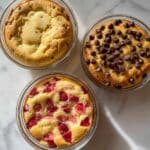 Three round baked cakes sit in clear glass bowls on a white marbled surface. The cake on the top left is plain with a golden brown top that is cracked and has a soft, fluffy texture. The cake on the top right is topped with many small, dark chocolate chips scattered across its golden brown surface, with a slightly cracked texture. The cake at the bottom has chopped red strawberries mixed into the batter and baked into the top, creating a pattern of bright red pieces on a golden brown and fluffy background. The bowls cast soft shadows on the white marbled surface. photo taken with an iphone --ar 4:5 --v 7