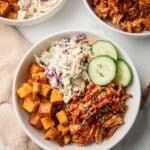 Keywords: BBQ chicken bowl, sweet potatoes, shredded chicken, coleslaw, Instant Pot recipe, healthy dinner, gluten free, weeknight meal