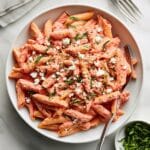 A white bowl filled with penne pasta covered in a thick, bright pink creamy sauce, with small white crumbles and green herb leaves scattered evenly on top. The sauce coats each pasta piece smoothly, creating a vibrant contrast with the white bowl. The bowl sits on a white marbled surface, with a silver fork and a small side bowl of chopped green herbs nearby. photo taken with an iphone --ar 4:5 --v 7