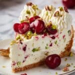 A slice of creamy white cheesecake with visible small green pistachio pieces and red berry bits mixed throughout is placed on a white plate with a gold rim, sitting on a white marbled surface. The cheesecake has a golden brown crust at the bottom. On top, there is a thick swirl of white whipped cream decorated with whole red cherries and pistachio nuts scattered around. A single red cherry rests on the plate near the slice. The overall look is fresh and colorful with a mix of smooth cream, crunchy nuts, and shiny fruits. Photo taken with an iphone --ar 4:5 --v 7