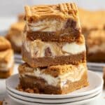 The image shows a stack of three square dessert bars on a stack of white plates, placed on a white marbled surface. Each dessert bar has multiple visible layers: the bottom layer is a golden-brown baked base with a dense texture, above it there is a gooey caramel and cream cheese layer with swirls of light beige and white, interspersed with darker brown cookie pieces. On top, a layer of whole rectangular golden-brown cookies with distinct imprint patterns is partially embedded into the dessert, adding a rough and crumbly texture. The bars have a slightly crumbly edge, with some crumbs scattered around. The overall look is rich and textured with warm brown and cream colors. Photo taken with an iphone --ar 4:5 --v 7