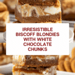 Keywords: Biscoff Blondies, blondie recipe, cookie butter blondies, white chocolate blondies, easy dessert, baked bars
