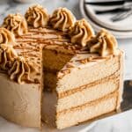 A close-up view of a round, two-layer vanilla cake with light brown frosting covering the outside and between the layers. The cake layers are soft and light beige, showing a delicate crumb texture. On top, there are swirls of creamy light brown frosting arranged in a ring around the edge, each swirl drizzled with caramel sauce and sprinkled with small brown cookie crumbs. A slice is being lifted by a spatula, showing the even thickness of both cake layers and frosting. The cake sits on a white plate, placed on a white marbled surface. Photo taken with an iphone --ar 4:5 --v 7