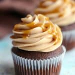 A close-up of a single chocolate cupcake with a rich, dark brown base wrapped in a white ridged paper liner, topped with two thick swirls of light tan frosting that are smooth and creamy with a few small air bubbles. The frosting is drizzled lightly with a golden caramel sauce, adding a shiny texture. The background features a textured white marbled surface with a slightly blurred second cupcake in the background, softly out of focus. Photo taken with an iphone --ar 4:5 --v 7