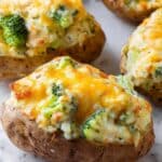 Keywords: twice baked potatoes, broccoli and cheese potatoes, cheddar baked potatoes, vegetarian side dish, comfort food