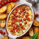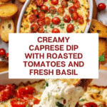 A deliciously creamy and savory Caprese Dip featuring roasted cherry tomatoes, a blend of mozzarella, provolone, and parmesan cheeses, fresh basil, and a hint of garlic. Perfect for parties or a cozy appetizer served warm with crusty bread, crackers, or tortilla chips.