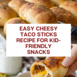 Keywords: Cheesy Taco Sticks, taco snack, baked tacos, easy family dinner, stuffed pizza dough, ground beef recipe, taco bites