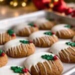 A tray of round gingerbread cookies with a cracked brown surface, each half-dipped and coated with smooth white icing that covers the bottom half of the cookie. Thick white icing lines are dripped diagonally across the dipped side, and a small decoration of green holly leaves with bright red berries sits near the top edge of the white icing. The cookies are arranged neatly on a white sheet on a silver baking tray, with blurred holiday lights and Christmas decoration in the soft background. photo taken with an iphone --ar 4:5 --v 7