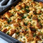 - Step 6: Bake the casserole uncovered for 35–40 minutes, until the stuffing is golden and the edges are bubbling.