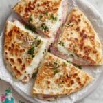 Chicken Cordon Bleu Quesadillas combine the classic flavors of chicken, ham, and Swiss cheese with a crispy tortilla for a delicious twist on two favorites. Topped with a creamy Parmesan Dijon sauce, this recipe is perfect for an easy lunch or dinner that feels special.