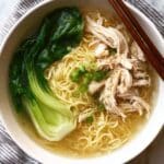This Chinese Noodle Soup features tender shredded chicken, flavorful chicken bone broth, and perfectly cooked egg noodles, garnished with fresh bok choy and scallions. This comforting soup is quick to prepare and makes a satisfying meal, combining the richness of homemade broth with the freshness of blanched greens.