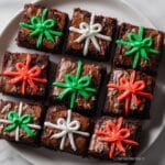 - Step 6: Drizzle or pipe the melted candy melts over each brownie in crisscross lines to mimic ribbons. Add mini candy bows or festive sprinkles on top for a holiday touch.
