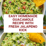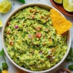 A classic and fresh guacamole recipe made with ripe avocados, tangy lime juice, diced tomatoes, onions, garlic, cilantro, and a hint of jalapeno. Perfectly creamy with a bit of chunky texture, this guacamole is an easy and flavorful dip for tortilla chips or a topping for your favorite Mexican dishes.