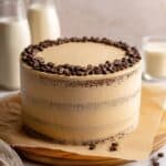 A three-layer chocolate cake with dark, moist cake layers separated by smooth light brown coffee-flavored frosting. The outside is fully covered with the same creamy coffee frosting. The top layer is decorated with whole coffee beans spaced around the edge. The cake sits on a wooden round board lined with parchment paper, atop a white marbled surface. Behind the cake, there are two clear glass milk bottles, one filled with milk, and soft beige pampas grass for a natural touch. photo taken with an iphone --ar 4:5 --v 7