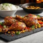 The image shows three golden-brown roasted chicken legs placed on a dark slate serving board. The chicken legs have a crispy, slightly shiny skin with visible small herbs and red chili flakes on top. They rest on a bed of roasted corn kernels mixed with small, charred cherry tomatoes and bits of sautéed red onions, all glistening with oil. Fresh cilantro leaves are scattered over the dish, adding green accents. In the background, there is a white bowl filled with plain white rice garnished with small herbs, and a black pan holding a dark sauce with corn visible in it. The whole setup is on a white marbled surface, with warm, softly blurred background lighting. Photo taken with an iphone --ar 4:5 --v 7
