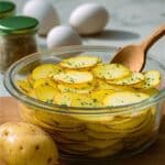 A glass bowl filled with two layers of thin yellow potato slices with light brown edges, sprinkled with small green herb bits, sits on a wooden board. A wooden spoon rests on the right side inside the bowl, partially touching the top potato slices. In the background, two white eggs and two small jars with green lids are blurred against a white marbled textured surface. A single whole yellow potato with brown spots lies in the foreground on the wooden board. photo taken with an iphone --ar 4:5 --v 7
