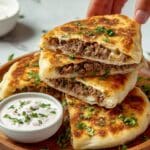 The image shows a stack of three stuffed flatbreads cut in half to reveal their filling. Each flatbread is golden brown with a crispy outside layer, while the inside has a thick layer of cooked ground meat mixed with finely chopped herbs. Below the meat layer is a thin spread of white sauce with small green bits, maybe herbs or onions. The flatbreads are placed on a round white plate on a white marbled surface, with a small white bowl of green sauce and some chopped herbs scattered nearby. A woman's hand is gently holding the top flatbread piece. Photo taken with an iphone --ar 4:5 --v 7