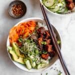 10. Serve: Enjoy the crispy gochujang tofu with rice, fresh cucumber, carrot, avocado, sesame seeds, or steamed broccoli as preferred.