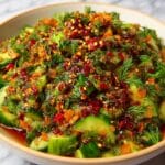 A close-up view of a mixed vegetable salad served in a white bowl with a light tan rim. The dish is full of chopped green cucumbers, sliced red bell peppers, and small orange carrot pieces, all mixed with finely chopped herbs like cilantro and dill, giving it a fresh green texture. The salad is generously topped with a dark red chili sauce dotted with yellow and red chili flakes, adding a glossy and spicy layer on top. The background shows a white marbled surface, enhancing the vibrant colors of the salad. photo taken with an iphone --ar 4:5 --v 7