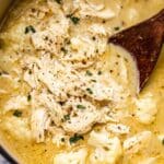 A close-up of a creamy yellow soup in a pot, filled with shredded white chicken pieces and soft, chunky cauliflower florets. The soup has a thick texture with visible specks of black pepper and finely chopped green herbs sprinkled on top. A wooden spoon is partially dipped into the soup, resting on the top right side. The colors mainly include pale yellow for the soup, white pieces of chicken, and light golden cauliflower, all bathed in the rich broth. The background has a white marbled texture. photo taken with an iphone --ar 4:5 --v 7