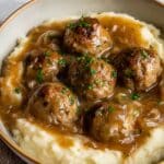 This Crock Pot French Onion Meatballs recipe combines savory frozen meatballs with sweet, caramelized onions and a rich brown gravy, all slow-cooked to perfection. Topped with melted Gruyère cheese, it’s a comforting and hearty dish perfect for serving over mashed potatoes, rice, or noodles.