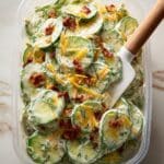 A quick and flavorful cucumber snack featuring crisp cucumber slices topped with shredded cheddar cheese, smoky bacon bits, and a blend of bold seasonings. Finished with a drizzle of creamy avocado lime ranch dressing and optional crunchy nuts or fresh herbs for added texture and freshness. Perfect as a light appetizer or healthy snack.