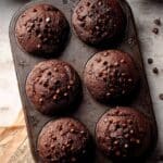 These Double Chocolate Muffins are rich, moist, and packed with both cocoa powder and mini semi-sweet chocolate chips for an intense chocolate flavor. Perfect for breakfast, snacks, or dessert, they have a tender crumb thanks to the balance of sour cream and butter, with a soft, slightly crumbly texture. Baking them spaced out ensures even cooking and beautifully domed tops.