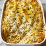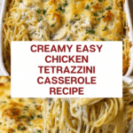This Easy Chicken Tetrazzini is a comforting and creamy baked pasta casserole featuring tender shredded rotisserie chicken, linguini noodles, and a rich sauce made from cream of chicken soup, cream cheese, and sour cream. Topped with a blend of mozzarella, cheddar, and Parmesan cheeses, this classic dish is baked until bubbly and golden brown, making it a perfect hearty meal for weeknights or family gatherings.