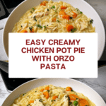 This easy creamy chicken pot pie is a comforting one-dish meal perfect for any night of the week. With tender chicken, tender orzo pasta, and a rich, flavorful sauce, it’s a satisfying twist on the classic pot pie without the fuss of a crust.