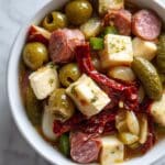 This Easy Marinated Cheese Appetizer combines bite-sized Havarti cheese cubes, savory salami, tangy sun dried tomatoes, crisp cornichons, and flavorful Castelvetrano olives, all marinated in a vibrant Italian-style vinaigrette with fresh basil. Perfect for entertaining or a simple snack, this no-cook appetizer offers a delightful mix of textures and bold flavors that develop beautifully when chilled.