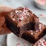 A close-up image of a square chocolate brownie held by a woman's hand, showing a bite taken out of the corner. The brownie has two main layers: a dense, dark brown, moist chocolate base, and a thick, smooth layer of chocolate frosting on top. The frosting is decorated with small, crushed red and white peppermint candy pieces scattered evenly across its surface, with swirling texture visible in the frosting. In the blurred background, two more brownies with similar frosting and toppings rest on a white plate set on a white marbled surface, with some peppermint pieces scattered around. photo taken with an iphone --ar 4:5 --v 7