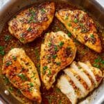This Garlic Butter Chicken recipe features perfectly seared boneless, skinless chicken breasts cooked in a fragrant garlic butter sauce with a splash of white wine or chicken broth. The chicken is seasoned with a flavorful poultry seasoning blend, creating a simple yet elegant dish that’s quick to prepare and bursting with savory goodness. Garnished with fresh parsley, this skillet-cooked entree is perfect for a satisfying weeknight dinner.