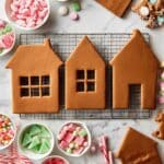 Store decorated gingerbread houses at room temperature in a cool, dry place. Avoid humidity to prevent the gingerbread from softening. Unassembled baked pieces keep well in an airtight container for up to a week or in the freezer for 2-3 months. To reheat, if desired, bring refrigerated or frozen pieces to room temperature before assembling and decorating to avoid cracking.