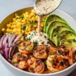 4. Assemble the Bowl: Begin by spreading the sliced or mashed avocado as the base in your serving bowl. Layer the grilled shrimp on top, then add a generous portion of the corn salsa. Drizzle the creamy garlic sauce over the top for a rich finish.