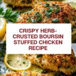 This Herb-Crusted Baked Boursin Chicken recipe transforms simple chicken breasts into a flavorful and elegant dinner. The chicken is stuffed with creamy Boursin cheese, coated with a crunchy herb and Parmesan breadcrumb crust, then baked to juicy perfection. It’s perfect for a special weeknight meal or entertaining guests.