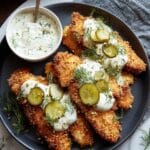 On a dark plate, several golden-brown breaded chicken fillets are stacked with a crispy texture, each topped with dollops of thick white creamy sauce. Thin, round slices of green pickles are scattered over the chicken, adding bright green spots, while small sprigs of fresh dill add a touch of herbal detail. To the side, there is a small white bowl filled with the same creamy sauce, garnished with dill. The plate rests on a white marbled textured surface with a folded grey cloth napkin nearby. The whole scene conveys a fresh, crunchy, and creamy dish. photo taken with an iphone --ar 4:5 --v 7