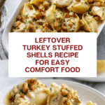 This comforting recipe transforms leftover Thanksgiving turkey, mashed potatoes, gravy, and stuffing into deliciously cheesy stuffed pasta shells. Baked to perfection with a blend of savory ingredients, these leftover turkey stuffed shells offer a creative and hearty way to enjoy post-holiday flavors in a simple casserole dish.