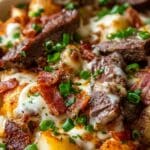 This Loaded Steak and Potato Bake is a hearty and comforting dish that combines tender beef steak, creamy potatoes, crispy bacon bits, and melted cheddar cheese, all slow-cooked together to perfection. Enhanced with a flavorful sour cream and garlic mixture, this casserole-style meal is ideal for a satisfying family dinner.