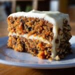 A single slice of carrot cake sits on a white plate, showing two layers of moist, brown cake mixed with visible orange carrot shreds and dark bits, possibly nuts or raisins. The top layer is covered with thick, creamy white frosting that slightly drapes over the edges, and some chopped nuts are visible on the side. The plate rests on a wooden surface with a blurred background inside a home setting. Photo taken with an iphone --ar 4:5 --v 7
