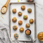 A metal baking sheet with a white parchment paper holds ten round cookie dough balls scattered evenly, each light brown with colorful candy pieces in red, blue, green, yellow, and orange mixed throughout. A metal cookie scoop holds one more dough ball with visible oats and candy bits, positioned near the right side. Around the baking sheet, there is a wooden spoon with oats on the top left, a glass jar filled with colorful candies to the top right, and a small white bowl with peanut butter at the bottom left. A soft white and gray striped cloth is draped around the bottom right corner, all set on a white marbled surface. Photo taken with an iphone --ar 4:5 --v 7