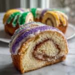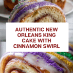 This New Orleans Style King Cake with Cinnamon Swirl is a festive and flavorful pastry perfect for celebrating Mardi Gras or any special occasion. Featuring a soft, cinnamon-spiced dough filled with a buttery cinnamon-sugar swirl, this cake is baked golden, then topped with a sweet vanilla glaze and vibrant purple, green, and gold sanding sugars. A small plastic baby optional surprise adds to the fun tradition.