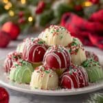 - Melt and Color the Coating: Melt the red and green candy melts separately following the package instructions. Use these to dip or coat the cheesecake balls, then decorate with holiday sprinkles before the coating sets.