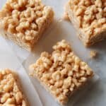 The image shows a close-up of four square treats made of small, light beige crispy pieces bound together in a sticky, glossy texture. Each treat is separated by a piece of white parchment paper beneath it, laid out on a white marbled surface. The shapes are irregular but roughly square, with a rough, bumpy texture showing the clusters of crispy bits clearly. The lighting makes the sticky coating shine softly, emphasizing the crunchy texture and the pale golden color of the treats. Photo taken with an iphone --ar 4:5 --v 7
