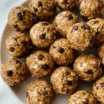 The image shows a close-up view of round energy bites stacked together. Each ball is light brown in color with visible oats and small dark chocolate chips mixed throughout. The texture looks soft and slightly sticky, with bits of oats giving a rough surface. The balls fill the white plate completely, creating a pile with some touching and overlapping each other. The background is a white marbled texture. photo taken with an iphone --ar 4:5 --v 7