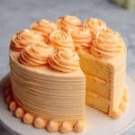 A four-layer round cake with each layer of soft yellow sponge separated by a light orange creamy frosting. The outside is covered with smooth, pale orange frosting with textured horizontal lines running around the sides. The top is decorated with large, swirled rosettes of the same light orange frosting arranged neatly across the surface. The bottom edge has small piped swirls of frosting matching the top. The cake sits on a white plate placed on a white marbled surface. photo taken with an iphone --ar 4:5 --v 7