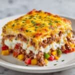 A thick slice of layered casserole on a white plate showing multiple layers: the bottom layer is a mix of cooked ground beef and diced colorful vegetables like red, yellow, and green bell peppers; above it are layers of melted white cheese stretching slightly on the sides, topped with a rich layer of browned melted cheddar cheese with green herb bits sprinkled over. The surface beneath is a white marbled texture. photo taken with an iphone --ar 4:5 --v 7