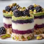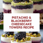 These Pistachio & Blackberry Cheesecake Towers are a delightful layered dessert featuring a crunchy pistachio-infused crust, a luscious blackberry compote, smooth cream cheese filling, and a rich pistachio cream topping. Perfect for impressing guests, this no-bake treat combines nutty, fruity, and creamy flavors in elegant individual towers.